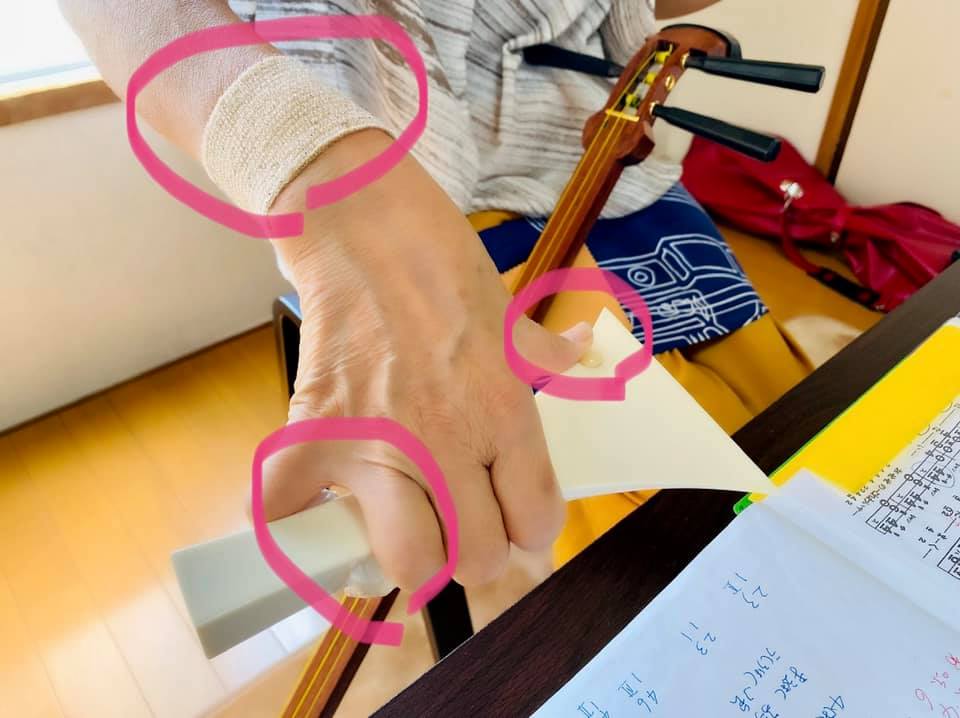 三味線歴3年弱の生徒さん。手が滑らないように、百均で買ったテーピングでお手製サポーターを作り、バチを握り込まないようにクッションで指位置を決定。(他の生徒さんにもかなり応用させていただいています)