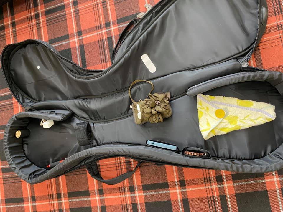 彼女はグッズを三味線を持ち運ぶときの軽量バッグに入れてます。忘れ物がないか一目瞭然。バチ入れもタオルハンカチで自作。