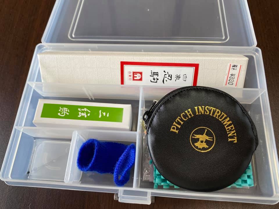 三味線を始めて半年の生徒さん。いろいろグッズをなくさないために、百均で買った透明BOXに保管。
